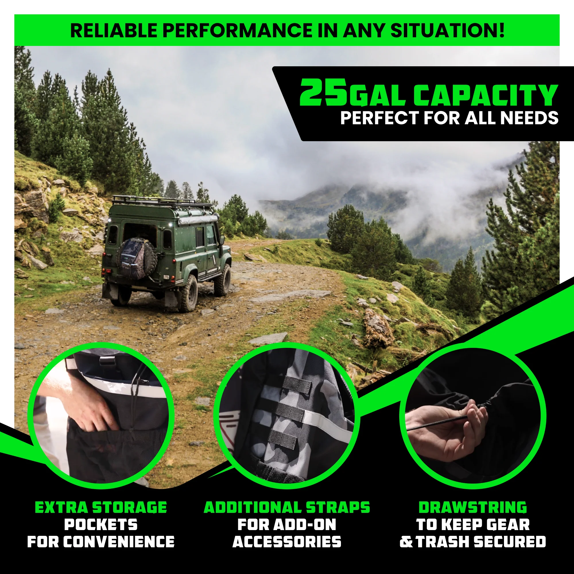 SPARE TIRE UP TO 40"Ā - Securely attaches to spare tires up to 40" size. A full 25 gallon capacity stores more than just trash!Ā The perfect addition for your over-landing and camping.